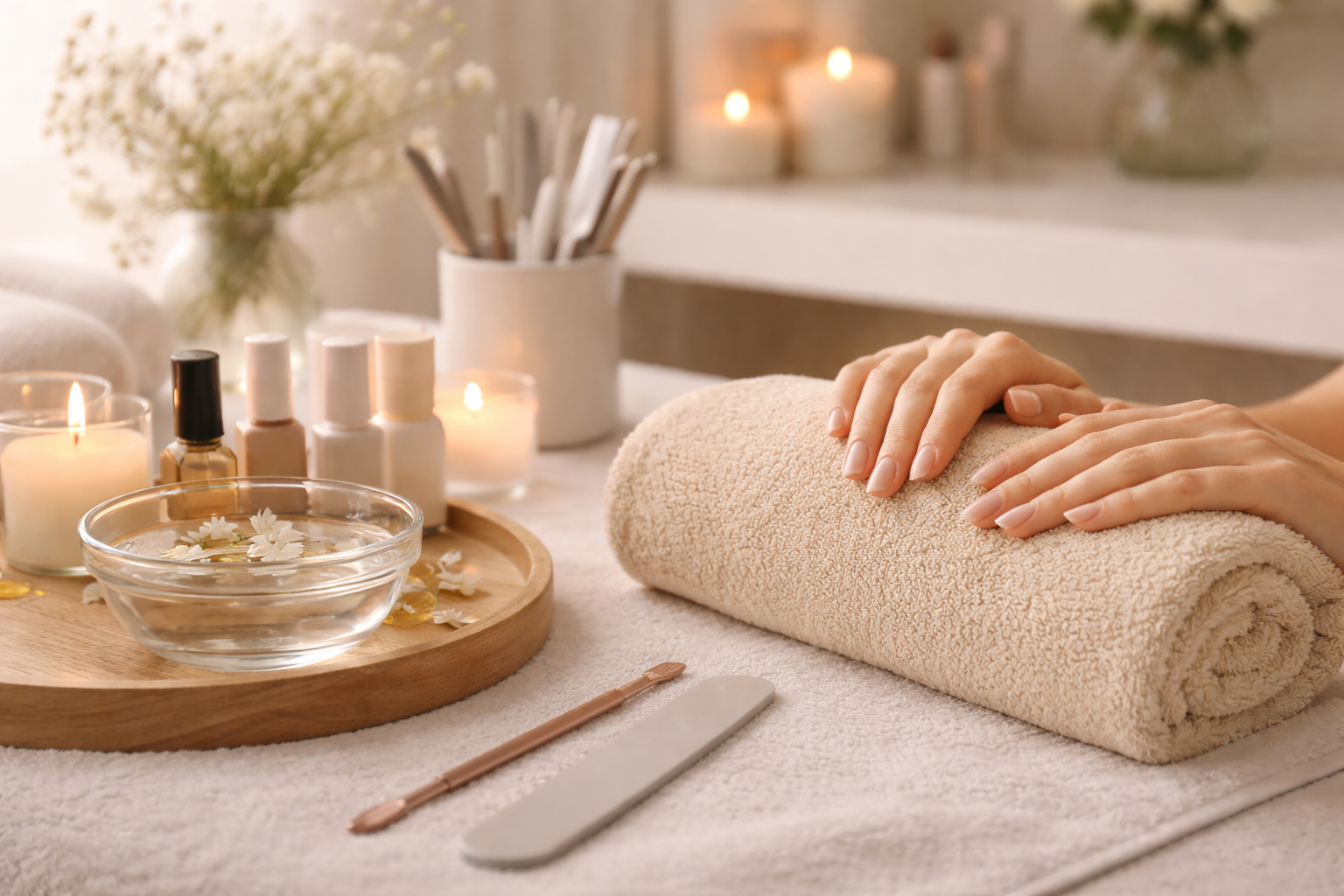 Nail care, cuticle care, scrub, masque, lotion application with massage, and polish.